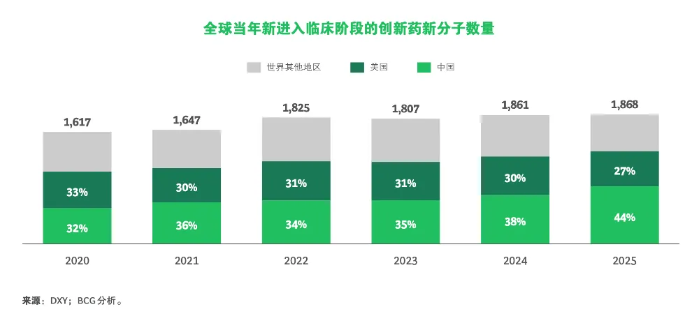 波士顿咨询公司(BCG)近期发布的报告进一步揭示,自2021年起,中国每年新进入临床阶段的创新药新分子(NME)数量已超过美国,并在随后几年持续扩大领先优势。