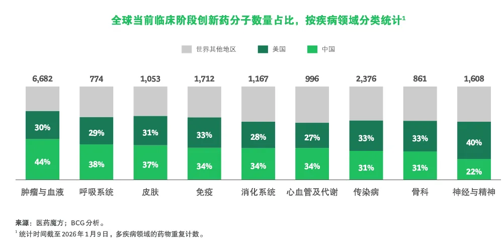 更值得关注的是,这种“数量”的增长正从单一赛道的高度集中,演进为数量与广度并进的结构性扩张——在呼吸系统、皮肤、免疫、消化系统与心血管等全球研发热点领域,中国当前处于临床阶段的创新药分子占比已超过美国。