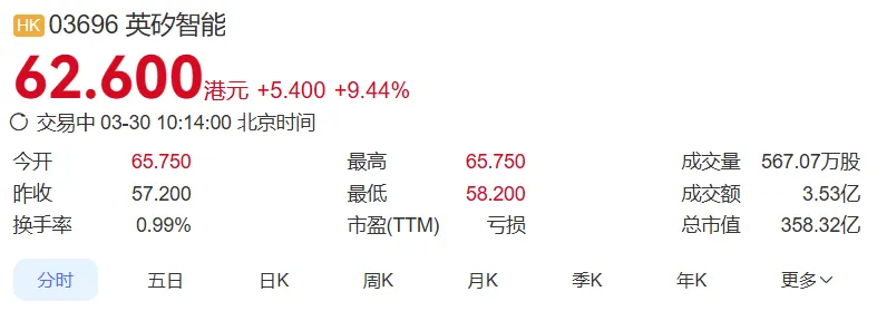 双重重磅消息再次引起行业和市场对该公司的高度关注。受此消息影响,英矽智能今日开盘股价曾一度大涨 9.44% 达到 62.6 港元/股,与发行价(24.05 港元/股)相比,累计涨幅高达 160%。