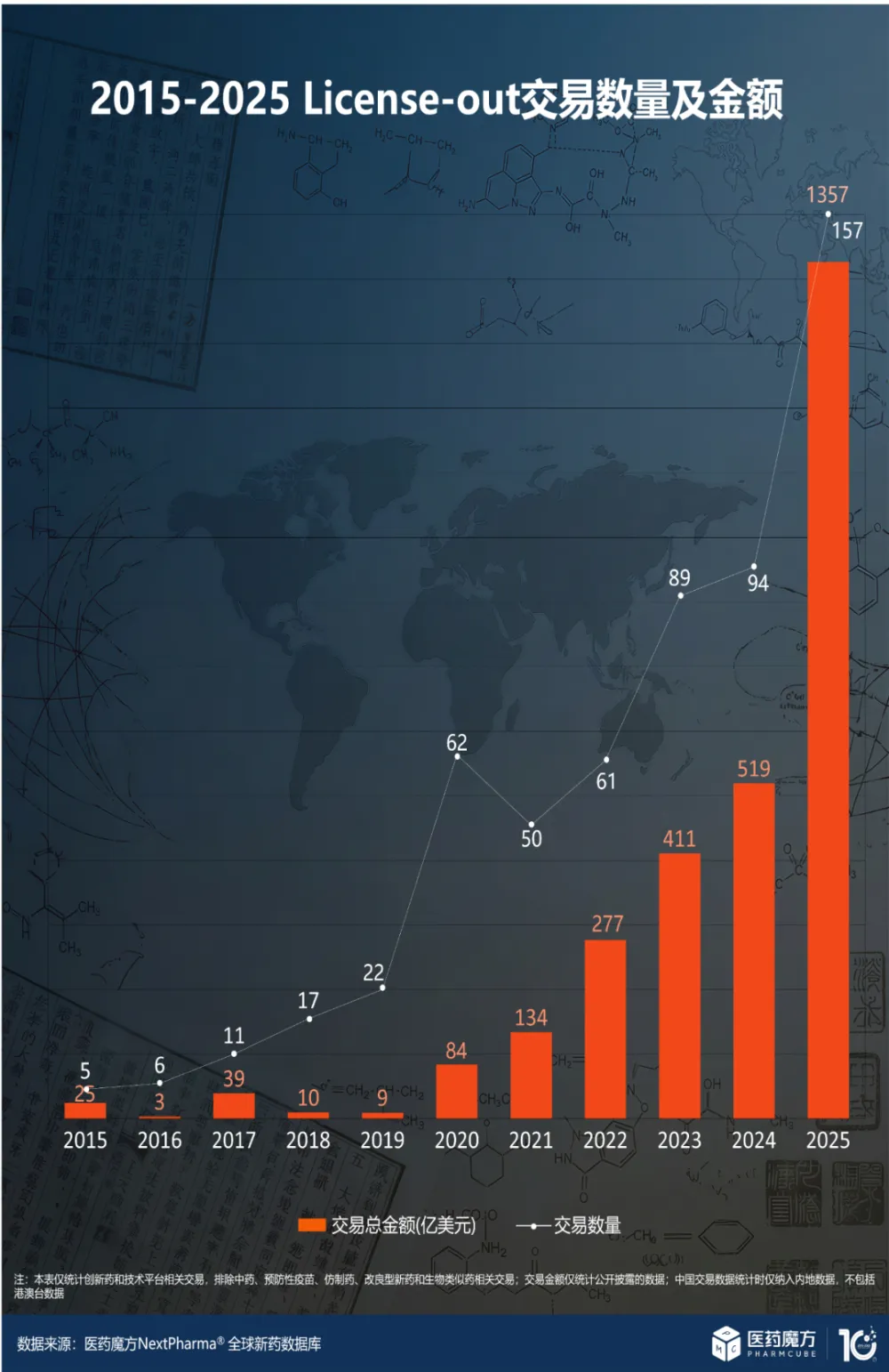 国家药监局及医药魔方数据库统计,2025年中国创新药对外授权交易总额达1357亿美元,首付款超70亿美元,交易数量157笔,均创历史新高。这意味着,平均每天有近3亿美元的国际资本为中国原研创新药买单。