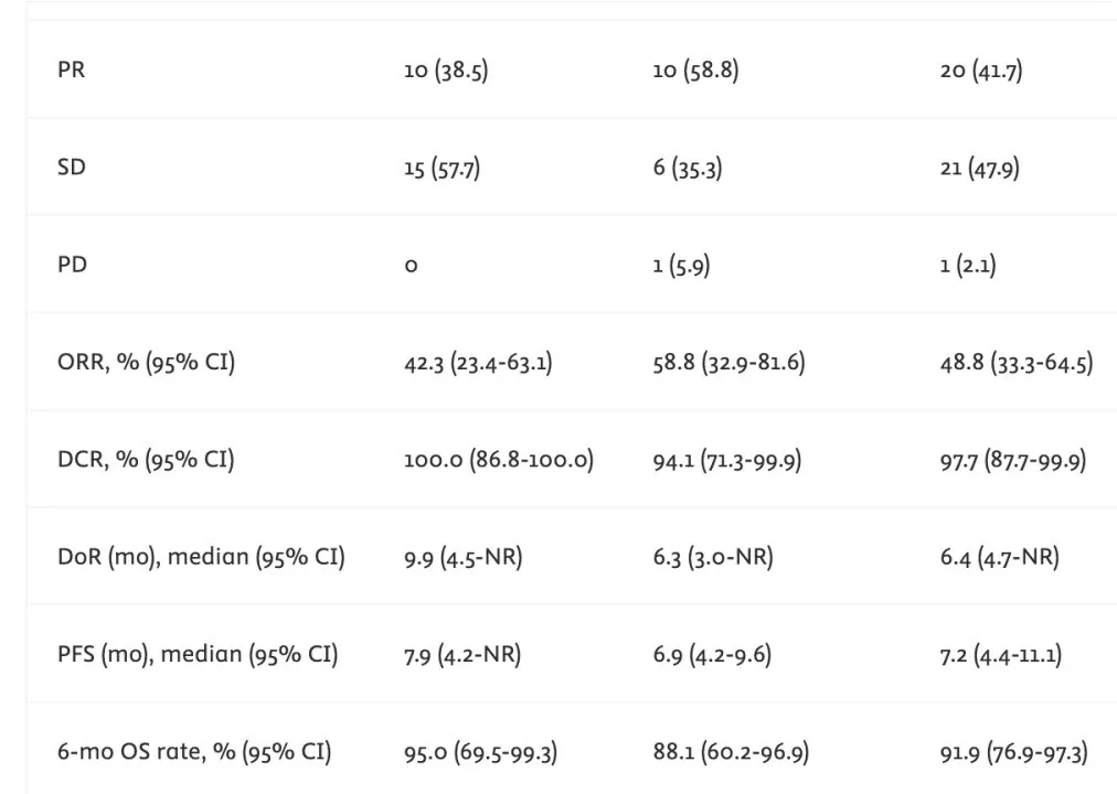 所有的临床数据对比如下图所示,说实话这个数据在铂耐药型卵巢癌中展现出来的效果确实还不错,在2.0+2.0mg/kg中的剂量组中展现出来的ORR非常惊艳,达到了58.8%,mPFS达到了7.2个月,而它的基线可以说非常差:78.3%的患者接受过≥2线铂类化疗;45.7%的患者在确诊铂类耐药后接受过≥1线非铂类化疗。