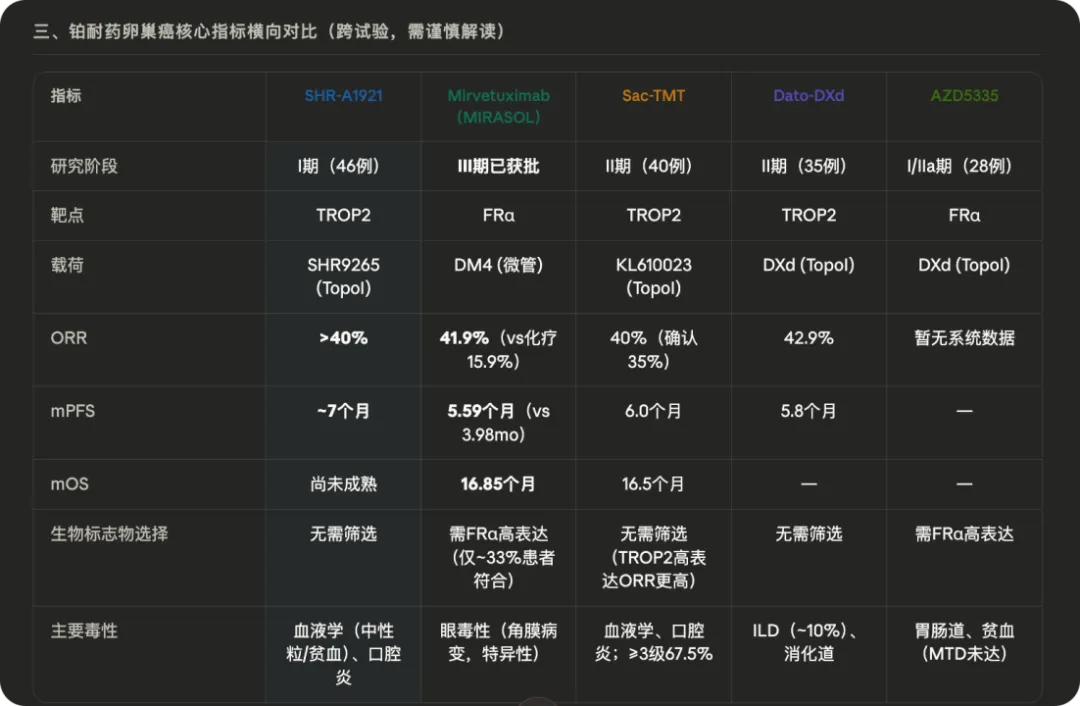 与之可以对比的是同靶点药物艾伯维的那款卵巢癌的黄金ADC——靶向FRα的Mirvetuximab,其三期临床ORR为41.9%,mPFS仅为5.59个月,并且该药导致的短期眼毒性较为严重,需要用糖皮质激素才能缓解。而且最重要的是,FRα的ADC必须要该靶点高表达的患者才能使用,这类患者只占卵巢癌患者的大约30%,而TROP2是出了名的万精油,不吃表达,不用筛选患者。