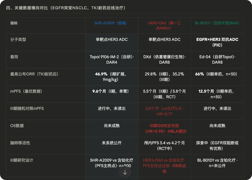 第四条管线是靶向HER3的SHR-A2009,第一三共的同靶点ADC在肺癌适应症上折戟,目前比较有看点的是恒瑞这条HER3 ADC管线在肺癌上拿到了FDA的快速通道资格,但是HER3 ADC的情况我们知道,虽然恒瑞的SHR-A2009做的不错,但是国内有断层式领先的双抗ADC——iza-bren,它的数据真的断层的好,且BL-B01D1也是HER3-DXd失败后最大的间接受益者:其EGFR×HER3双靶点机制提供了更合理的生物学假说——通过同时阻断EGFR信号通路和HER3介导的逃逸信号,有望将PFS改善真正转化为OS获益。