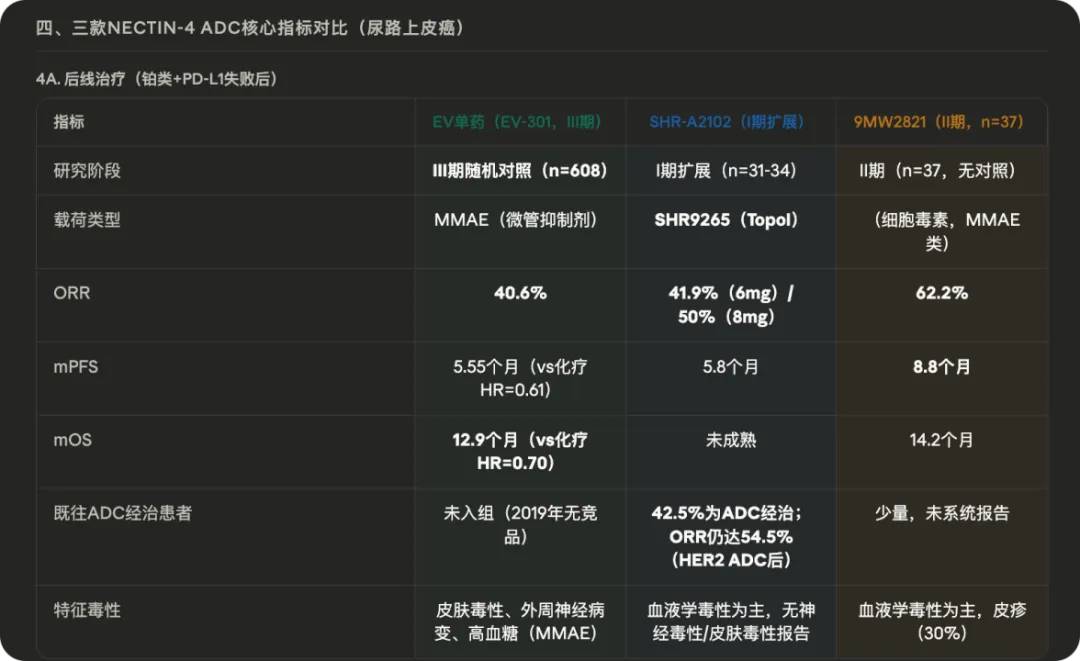 不过很遗憾地说,SHR-A2102在这个靶点中可能不是best in class,2026年不仅A2102的三期临床数据要读出,9MW2821的三期临床数据也要面临读出。并且现在主要的看点在于Nectin-4 ADC与PD-1单抗的联用,例如9MW2821与特瑞普利单抗联用在一线UC患者中,cORR达到了80%。而padcev+Pembro的一线III期ORR为67.7%,并且其最终mOS达33.8个月,拖尾效应非常显著。