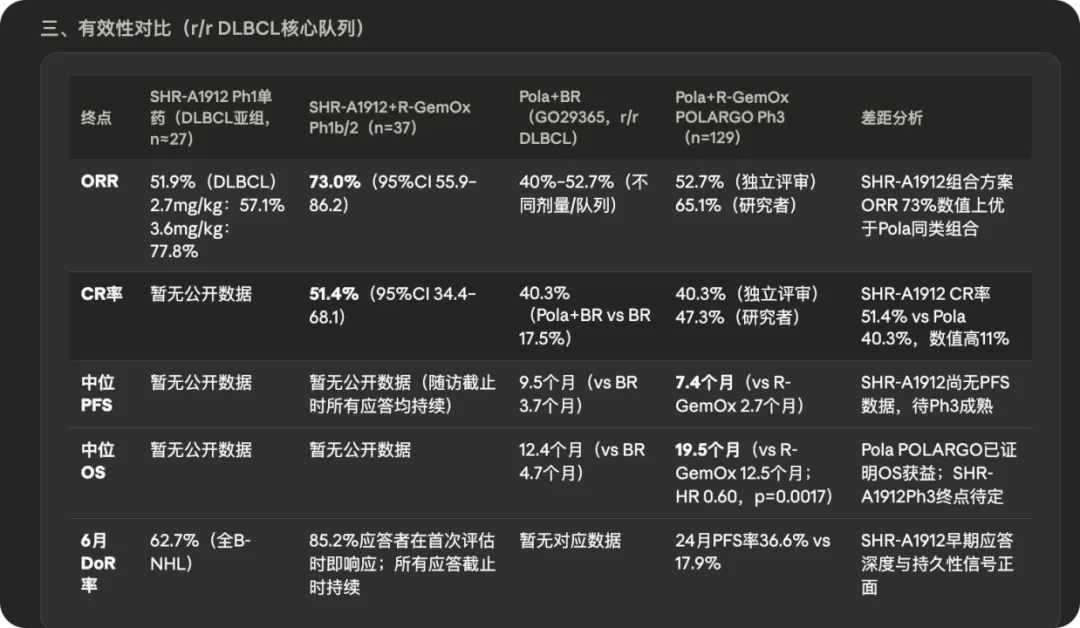 第六条管线是靶向CD79b的SHR-A1912,其核心适应症是r/r DLBCL,有时候会联用R-GemOx,主要目标也是超过罗氏的pola,又是一场DXD毒素对早期MMAE的降维打击,同在联用情况下,ORR和CR率要明显更高。且Pola-R-CHP方案中外周神经毒性达52.9%,而SHR-A1912不存在神经毒性的问题,小样本试验中只有1例ILD。