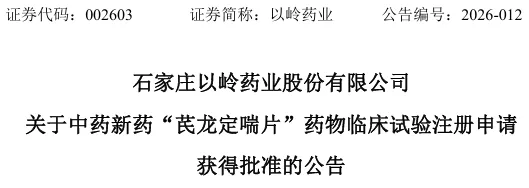 3月27日,以岭药业发布公告,其中药1.1类新药芪龙定喘片获得临床试验默示许可,拟用于慢性阻塞性肺疾病。米内网数据显示,2025年中国三大终端六大市场呼吸系统疾病中成药销售规模超760亿元,以岭药业在一级集团格局中位列TOP7。