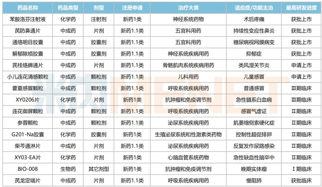 从最高研发进度看,中药1.1类新药解郁除烦胶囊(抑郁症)、通络明目胶囊(糖尿病视网膜病变)、芪防鼻通片(持续性变应性鼻炎)和化药1类新药苯胺洛芬注射液(术后疼痛)均已获批上市;2款中药1.1类新药芪桂络痹通片(类风湿关节炎)、小儿连花清感颗粒(儿童感冒)报产在审,中药1.1类新药藿夏感冒颗粒(普通感冒)和化药1类新药XY0206片(急性髓系白血病)已步入Ⅲ期临床,上市可期。