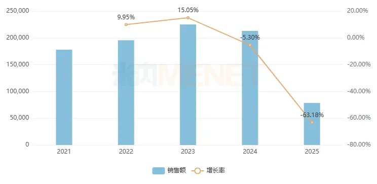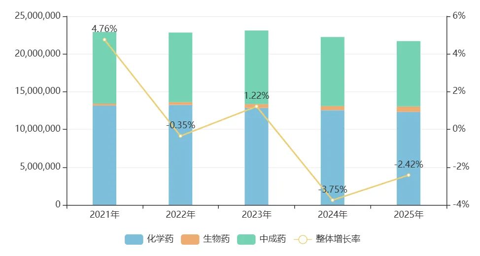 从药品类型来看,化学药依然占据了半壁江山,2025年销售额为1232亿元,跌幅为1.77%,低于整体水平。生物药的销售额持续攀升,2025年涨幅高达30.23%,销售额涨至71.8亿元新峰值。中成药的占比首次跌破四成,2025年销售额为866.6亿元,跌幅为5.28%,高于整体水平,情况危急。