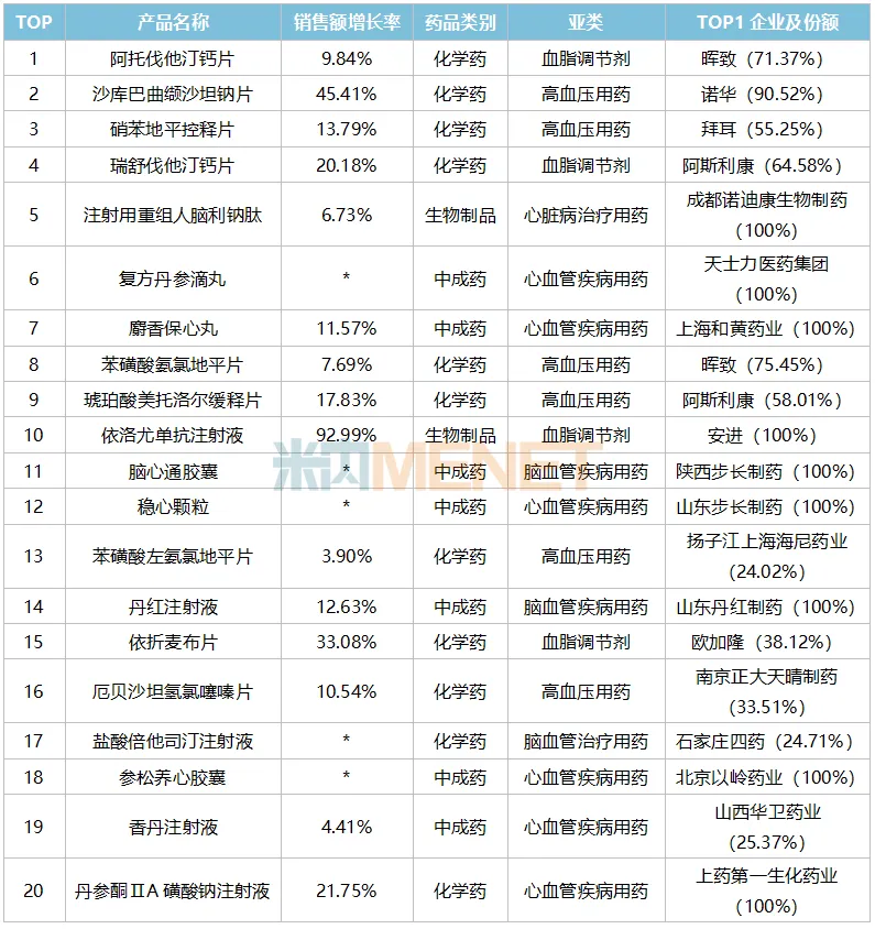表2:2025年中国公立医疗机构终端心脑血管药物(化中生)TOP20产品