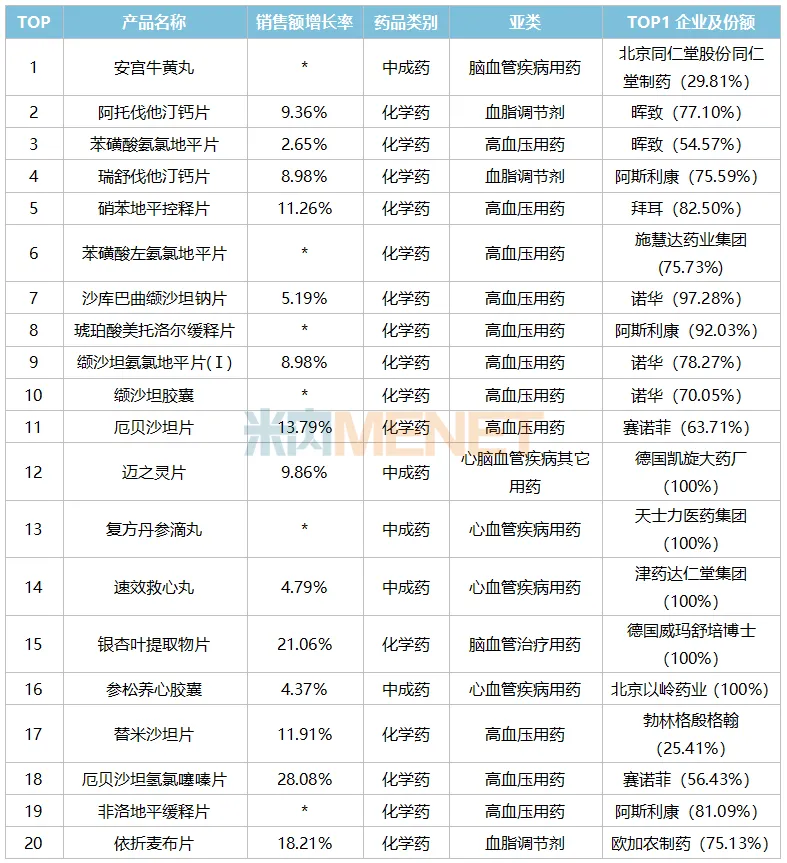 表3:2025年零售药店终端心脑血管药物(化中生)TOP20产品