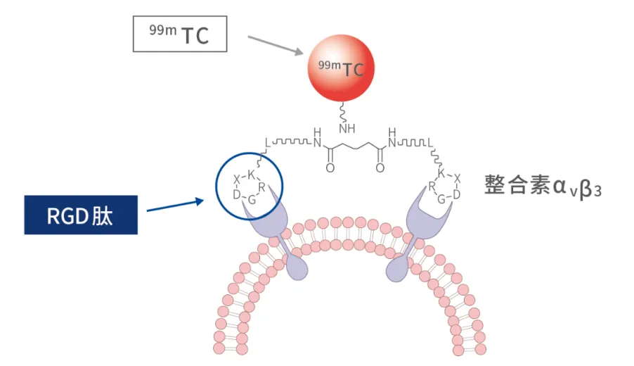99mTc-3PRGD2作为一款RDC,其由通过Linker将以整合素αvβ3为靶点的RGD多肽分子探针与放射性核素锝[99mTc]相偶联,从而达到RGD多肽分子探针精准靶向肿瘤新生血管和肿瘤表面过表达的αvβ3受体,完成核素精准递送并实现肿瘤显像。