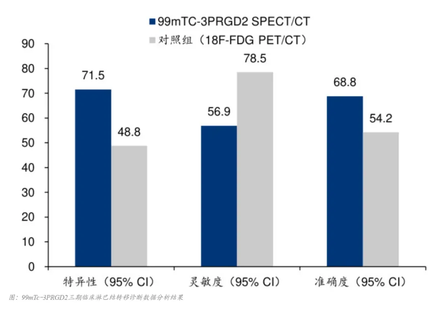 99mTc-3PRGD2头对头现有主流18F-FDG临床三期数据,更是进一步验证了其成为肿瘤诊断金标准的迭代实力:在409例肺部肿瘤淋巴结转移的患者诊断中,99mTc-3PRGD2的特异性和准确性分别为71.5%和68.8%,显著高于对照组18F-FDG PET/CT的48.8%和54.2%,更高的特异性这意味着99mTc-3PRGD2在淋巴结转移判断上假阳性更少。在淋巴结转移这种容易受炎症干扰的场景中,特异性提升凸显更高的临床价值。另外安全性方面,接受99mTc-3PRGD2诊断的患者不良反应发生率为2.9%,且均为1–2级。