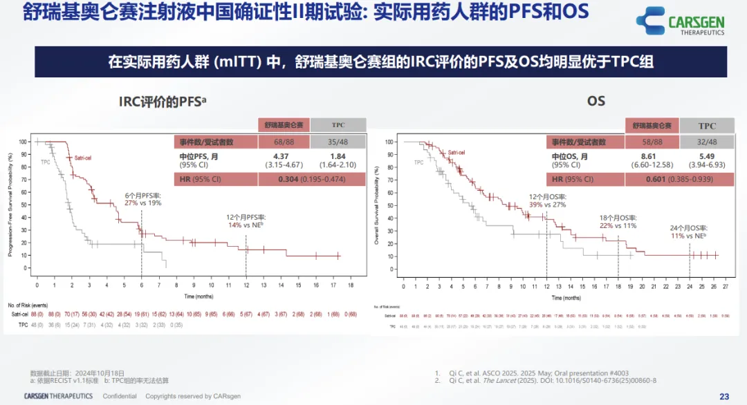 研究结果显示,在 ITT 即所有随机人群中,基于 IRC 评价,舒瑞基奥仑赛较标准治疗可显著延长 PFS(mPFS 3.25 个月 vs 1.77 个月;HR 0.366),达到试验的主要终点,患者疾病进展/死亡风险显著下降达 63%。同时 OS 显示出明显的获益趋势(mOS 7.92 个月 vs 5.49 个月;HR 0.693)。
