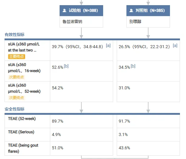 在为期 16 周的核心治疗期后,鲁兹诺雷钠片组 39.7% 的患者最后两次 sUA 水平 ≤360 μmol/L(临床达标阈值),显著高于对照组的 26.5%,治疗差异 13.1%(单侧 p<0.0001)。