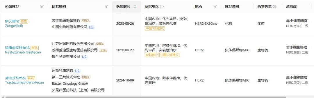 2025 年 7 月 23 日,拜耳塞伐艾替尼(BAY 2927088)申报上市,适应症为用于治疗携带 HER2(ERBB2)激活突变且既往接受过一种全身性治疗的晚期或转移性非鳞状非小细胞肺癌(NSCLC)成人患者。