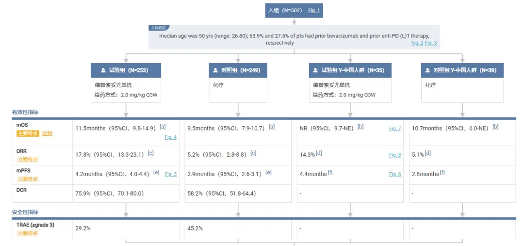 结果显示,与化疗相比,维替索妥尤单抗降低死亡风险 45%,这些患者曾接受过标准系统性治疗,其中超过一半的中国人群曾接受过抗 PD(L)1 治疗。经过 11.5 个月的中位随访,维替索妥尤单抗组的中位 OS 未达到,而化疗组的中位 OS 为 10.7 个月。PFS 和确认的 ORR 的次要终点也有利于使用维替索妥尤单抗治疗。维替索妥尤单抗在中国亚组中的安全性是可控的,与全球概况一致。