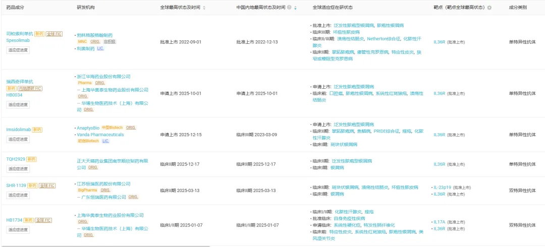 根据 Insight 数据库统计,目前国内共有 6 款 IL-36R 抗体进入临床阶段,仅有勃林格殷格翰的 IL-36R 抗体司柏索利单抗获批治疗 GPP,瑞西奇拜单抗是首个申报上市的国产 IL-36R 单抗。
