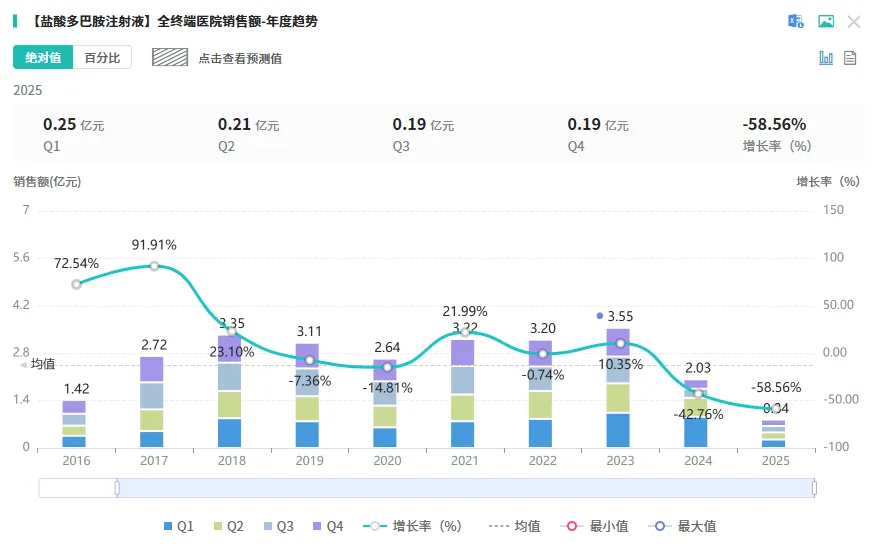 被取消中选资格的盐酸多巴胺注射液,是用于休克、心衰等危重症的临床急救“刚需”药物,属国家医保甲类品种。摩熵医药数据显示,该品种在2024年其院内市场规模仍超2亿元。