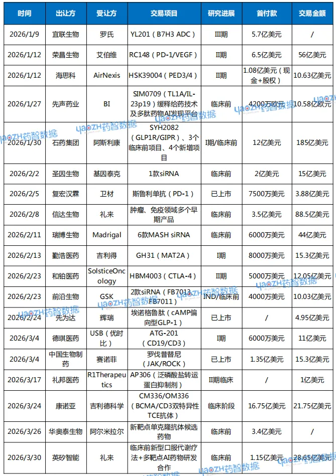 今年Q1,大额交易已经明显向平台合作和早期绑定延伸。1月30日,石药与阿斯利康达成合作,阿斯利康支付12亿美元预付款,总金额最高可达185亿美元,合作内容不只包括SYH2082,还覆盖缓释给药技术、多肽药物AI发现平台以及多个临床前项目。阿斯利康买下的并不是一条现成资产,而是一整套可持续产出项目的能力。