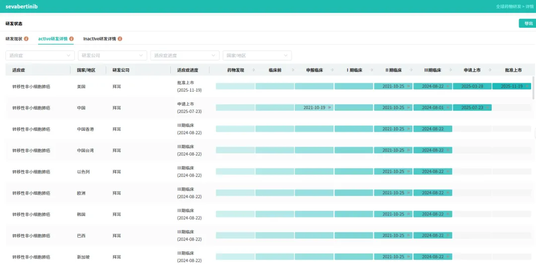 塞伐艾替尼片(sevabertinib)是拜耳研发的一款口服、非共价、可逆选择性酪氨酸激酶抑制剂,可抑制携带EGFR及HER2突变(包括HER2 exon 20插入突变)的肿瘤生长。2025年7月,该药首次在中国申报上市,用于既往接受过一种系统治疗的HER2突变晚期NSCLC患者。此次将适应症前移至一线治疗,显示拜耳正加速推进该药在更早治疗阶段的应用布局。