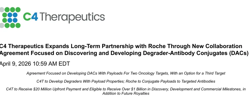 C4 Therapeutics总裁兼首席执行官Andrew Hirsch表示:“在过去的十年里,C4T和罗氏合作推动了靶向蛋白质降解的研究,并将这种药物形式确立为治疗癌症的新方法。我们的新合作利用了C4T设计高度催化和选择性降解剂的能力,以及DAC的降解剂有效载荷,以及罗氏开发具有特异性结合的ADC的丰富经验。这些能力共同构建了一种强大的新药物形式,可以为患者提供变革性药物。”