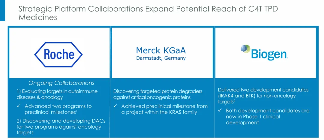 C4T将为这两个项目获得2000万美元的预付款。如果罗氏行使其对第三个靶点的选择权,C4T将获得额外付款。在整个合作过程中,C4T将获得近期发现里程碑付款。C4T有资格获得超过10亿美元的发现、监管和商业里程碑付款。此外,C4T有权在未来的销售中获得分层特许权使用费,但在合作协议中所述的某些情况下可以减少。