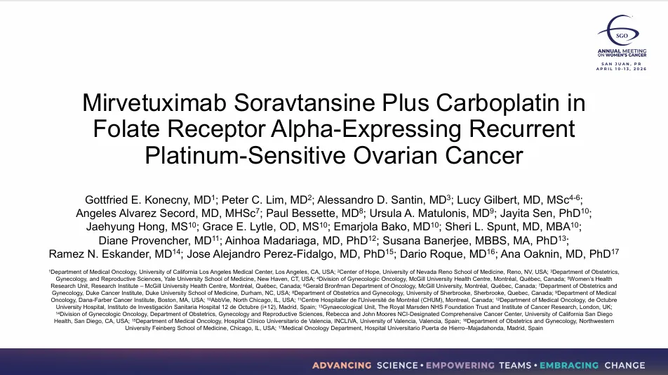 IMGN853-0420是首个证实ADC与卡铂在卵巢癌中可联合使用的试验,MIRV+卡铂在PSOC中有效,尤其在PARPi经治人群中仍保持活性,为铂敏感卵巢癌(包括PARPi经治)提供有前景的治疗选择,同时艾伯维还正在评估MIRV+卡铂作为新辅助化疗(NACT)的应用(GOG-3115试验)。