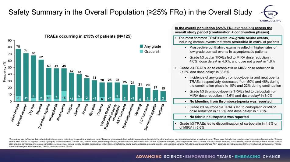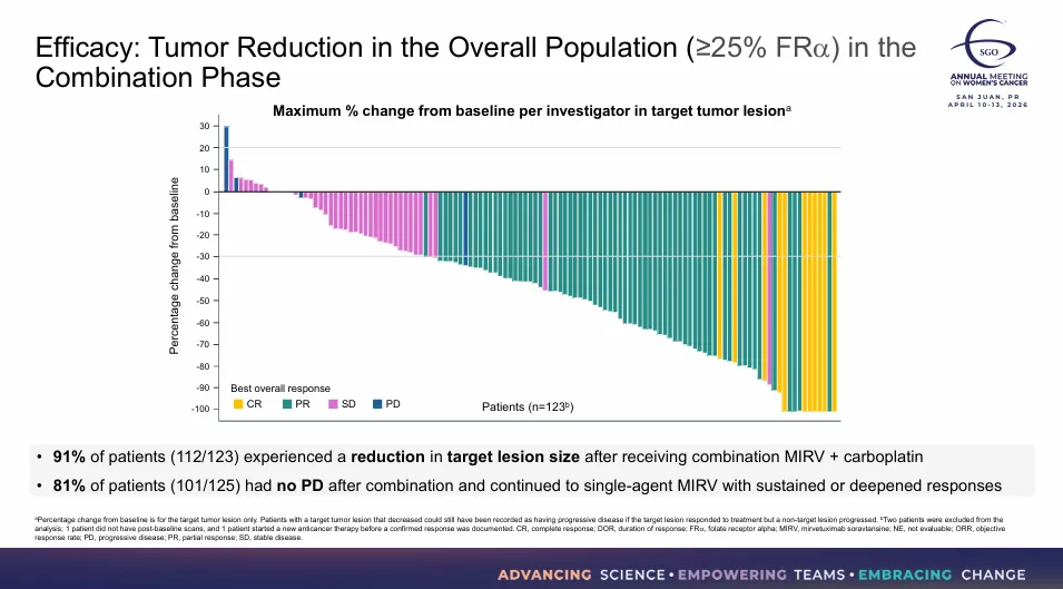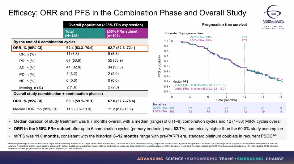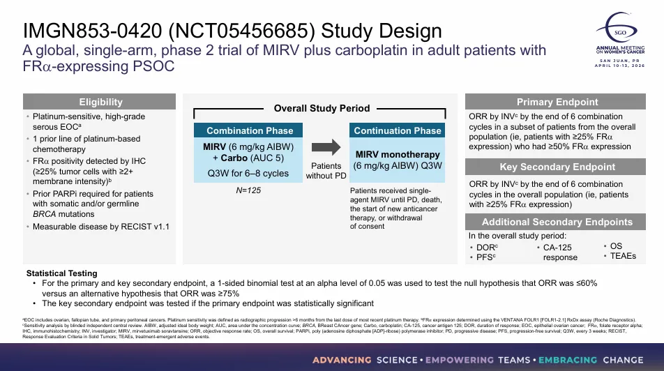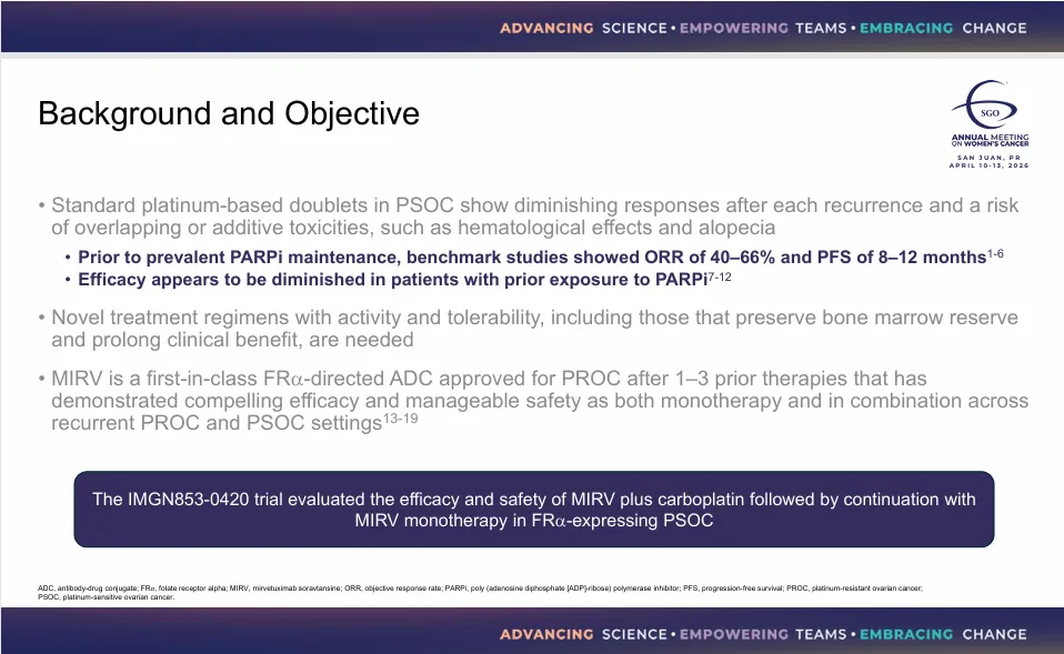 2026年4月12日,正在举行的2026年美国妇科肿瘤学会(SGO)上,艾伯维以口头报告的方式,公布了FRα ADC药物Mirvetuximab Soravtansine(MIRV),联合卡铂治疗铂敏感卵巢癌(PSOC)的II期临床IMGN853-0420数据,其也成为首个证实ADC与卡铂在卵巢癌中可联合使用的临床试验。