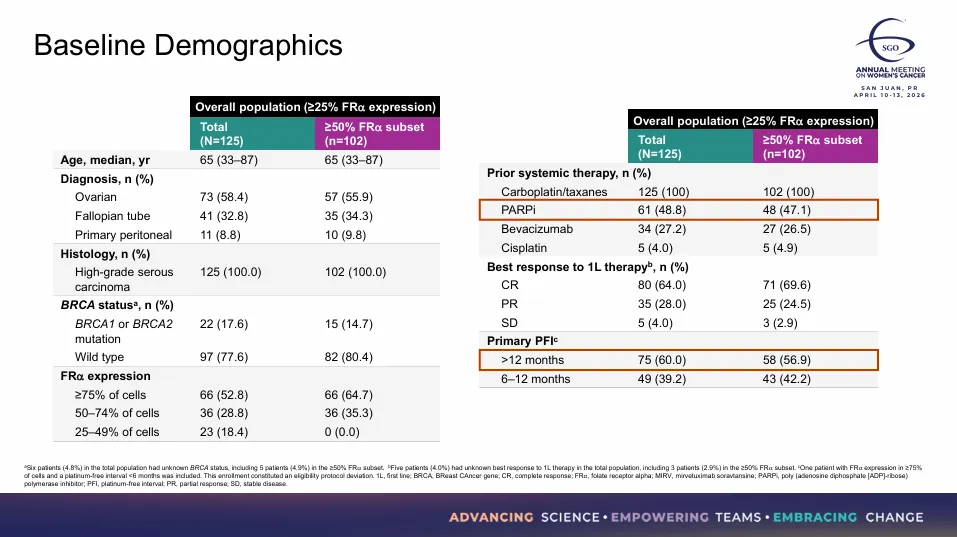 这项名为IMGN853-0420的多中心、开放标签II期试验共招募了125名FRα表达≥25%的铂敏感卵巢癌(PSOC)患者,这些患者此前均接受过一次基于铂类药物的化疗方案。