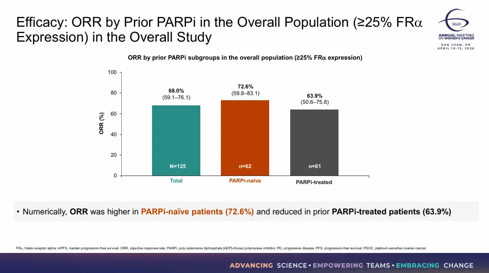 但值得关注的是,PARPi初治患者ORR更高(72.6% vs 63.9%),但PARPi经治患者仍保持较高缓解率,这是首个在约50%