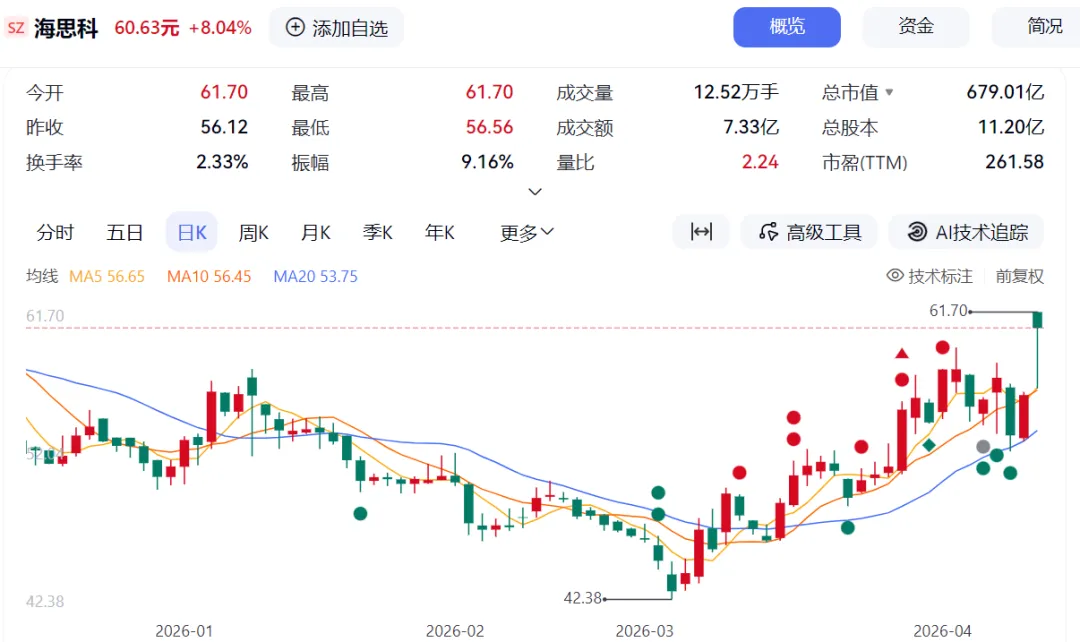 截至4月13日收盘,海思科股价收报60.63元/股,较前一交易日上涨8.04%,公司总市值达679.01亿元。市场对这份业绩反转与BD大单同步落地的公告给予了积极回应。