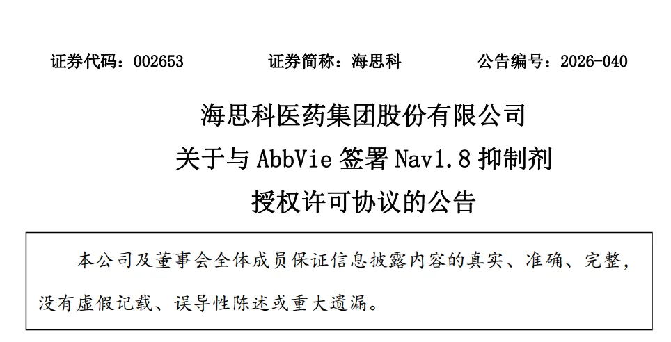 2026年4月12日晚间,海思科医药连发三份重磅公告,在披露2025年全年业绩的同时,宣布与全球制药巨头艾伯维(AbbVie)签署Nav1.8抑制剂授权许可协议,并同步公布2026年第一季度业绩预告。