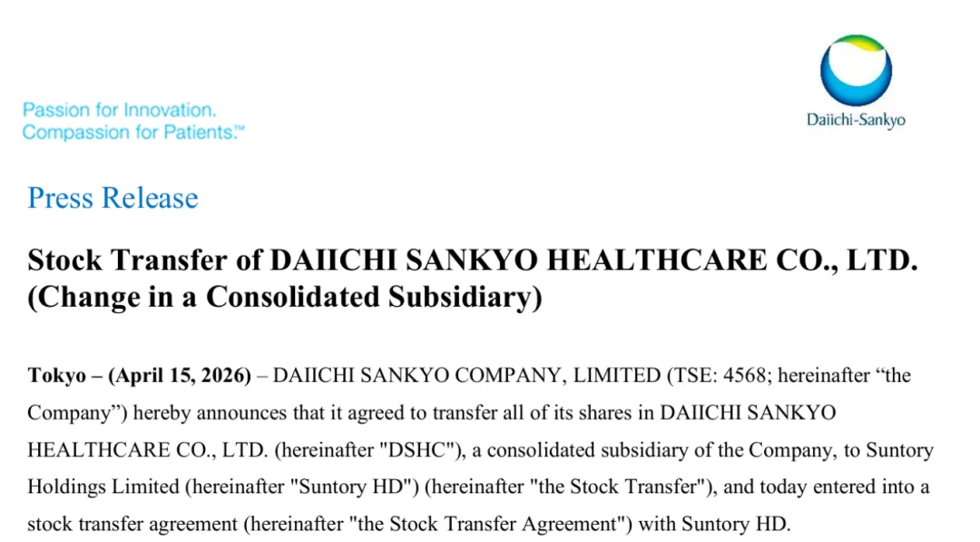 4月16日,跨国药企第一三共宣布,与三得利控股正式签署股权转让协议,将旗下全资子公司消费者健康业务板块DSHC,以2465亿日元(折合约15.51亿美元)的总交易对价,整体转让给日本食品饮料巨头三得利控股。