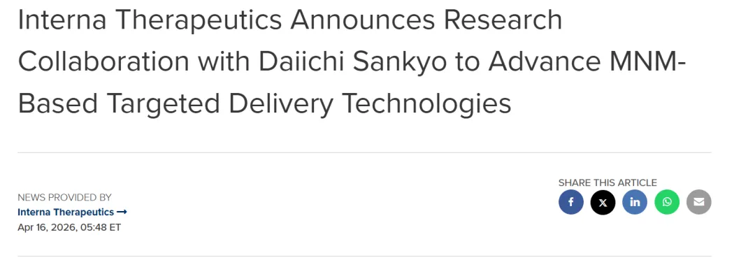 Interna公司的MNM平台旨在实现多种治疗性载荷(包括核酸及其他大分子)的高效胞内递送,且无需依赖传统递送系统。通过增强胞内进入能力与组织穿透能力,MNM有望显著提升多种适应症下靶向疗法的疗效。