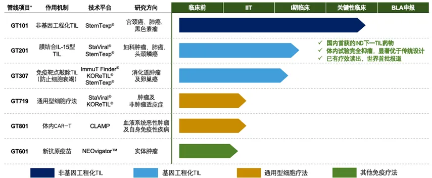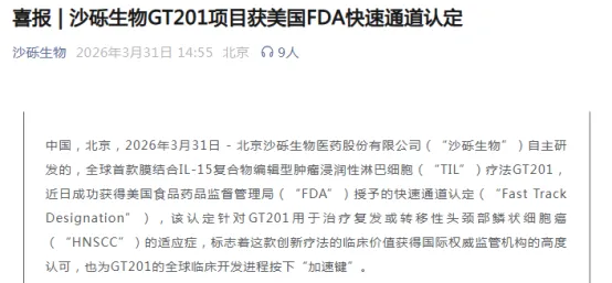 2026 年 3 月,GT201 获得美国 FDA 授予的快速通道认定,针对复发或转移性头颈部鳞状细胞癌(HNSCC)适应症。此前,GT201 已在中美两地获批 IND 并进入 1 期临床研究,其中国内 IND 于 2023 年 7 月获批,为国内首款进入注册临床试验的基因编辑型 TIL 疗法;美国 IND 于 2024 年获批。