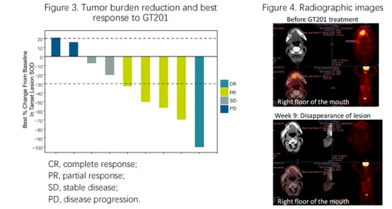 在临床数据方面,GT201 已在多个实体瘤适应症中展示了扎实的疗效。ASCO 2025 年会上公布的数据显示,9 例可评估的晚期实体瘤患者中,GT201 实现了 55.6% 的客观缓解率和 77.8% 的疾病控制率,尤其是在头颈鳞癌和非小细胞肺癌中表现突出。其中一例来自上海交通大学医学院附属第九人民医院的 61 岁男性患者(该患者为多线治疗失败的晚期口底癌伴颈部多发淋巴转移),在接受 GT201 回输后仅 3 周即达到部分缓解,第 9 周随访时影像学显示所有病灶完全消失,达到完全缓解。安全性方面,未观察到与 GT201 直接相关的 3 级以上不良事件。