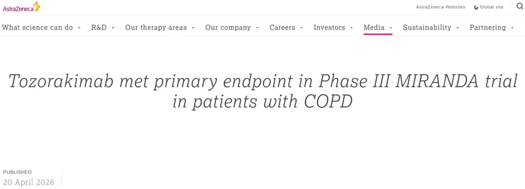 这是继2026年3月OBERON和TITANIA两项III期试验取得积极结果后,Tozorakimab在COPD领域获得的第三项成功的关键性III期临床研究,进一步夯实了该药物作为IL-33通路首个COPD生物制剂的循证基础。