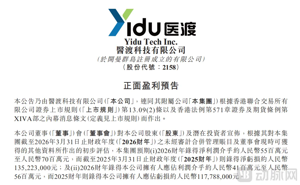 4月20日,医渡科技(02158.HK)发布正面盈利预告,预计2026财年(截至2026年3月31日)实现净利润约5500万至7000万元人民币。这是公司成立11年以来首次录得全年盈利,相较于上一财年1.35亿元的净亏损,此次完成了从持续亏损到稳定盈利的关键跨越。