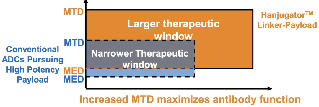 ADC领域同样正在经历范式变化。过去行业普遍追求更高毒性的payload,但临床实践逐渐表明,高毒性往往限制给药剂量,从而削弱抗体本身的作用。ADC开发的核心矛盾,已经从“如何增强杀伤”转向“如何在毒性与暴露之间取得最优平衡”。 Hanjugator™平台正是在这一背景下提出,其核心不在于单一参数的提升,而在于通过模块化设计实现payload强度的可调节,并结合高亲水性连接子与优化DAR,使抗体功能与毒素作用形成协同。