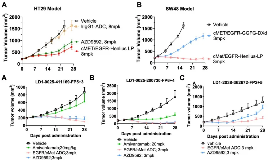 从临床前数据来看,HLX48在多种模型中展现出显著抗肿瘤活性,并在HT29结直肠癌等CDX和PDX模型中优于AZD9592。同时,在食蟹猴中高剂量给药下仍保持良好耐受性,验证了其中等毒性设计策略的可行性。这一点对于EGFR/c-MET这一类需要较高剂量覆盖的靶点尤为关键。