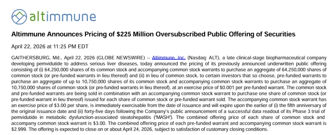 4月22日,Altimmune宣布进行超额认购,将募资约2.25亿美元。本次认购预计将于2026年4月24日前后完成。