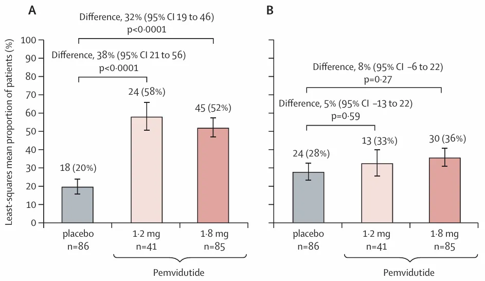 Pemvidutide组和安慰剂组达到MASH缓解且纤维化未加重的患者比例分别为58%、52%和20%,达到纤维化至少改善1期且MASH未恶化的患者比例分别为33%、36%和28%。