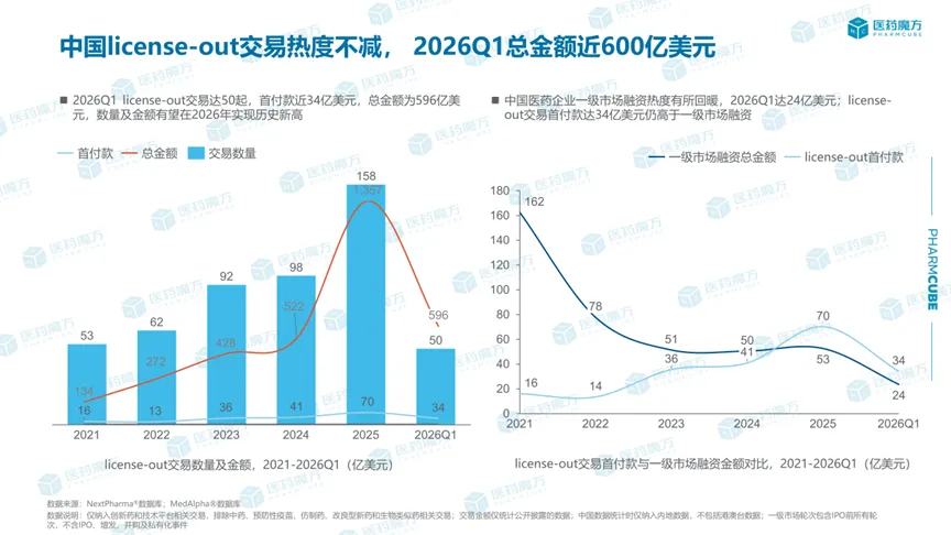 2026年第一季度,中国License-out交易延续增长态势,多项核心指标呈现积极变化。据医药魔方NextPharma®及MedAlpha®数据库统计,当季交易数量达50起,总金额596亿美元,首付款34亿美元,数量及金额均有望在2026年刷新历史纪录。值得关注的是,相关交易首付款规模仍高于同期国内医药企业一级市场融资金额,预计未来将进一步带动一级市场融资环境的回暖与信心增强。