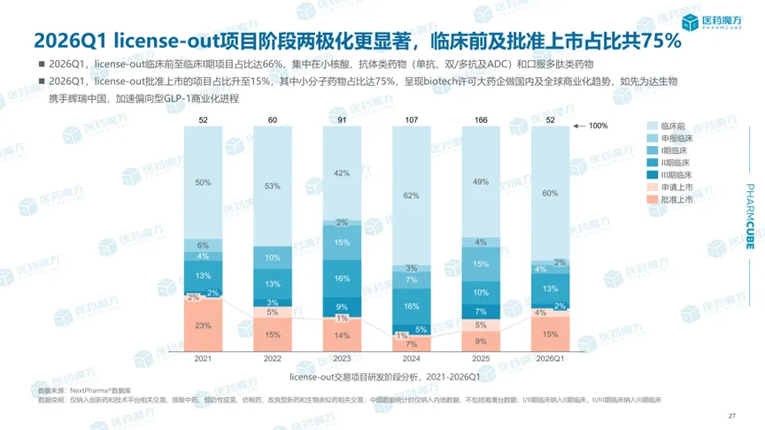从项目类型与研发阶段看,小分子药物和临床前项目仍是境内交易主流。2026