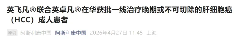 4 月 27 日,阿斯利康宣布,NMPA 已正式批准「曲麦利尤单抗」联合「度伐利尤单抗」用于晚期或不可切除的肝细胞癌(HCC)成人患者的一线治疗适应症在中国上市。