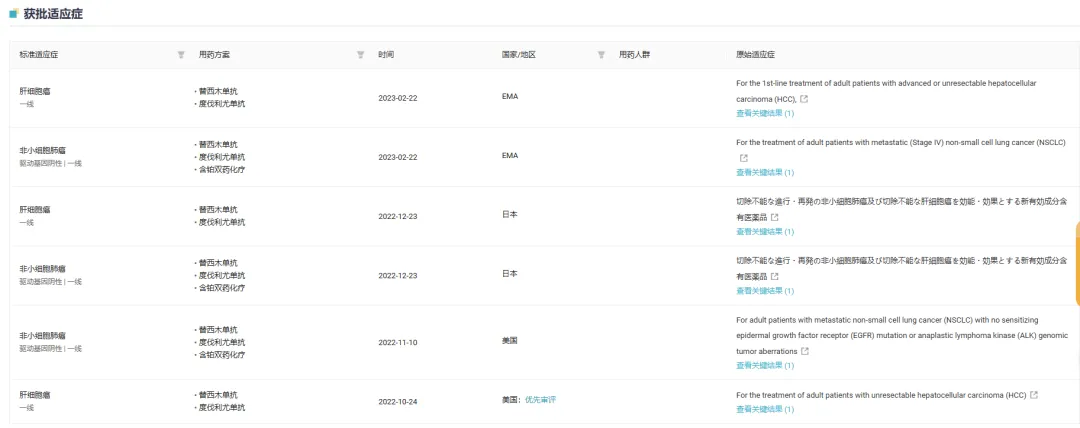 Insight 数据库显示,该药最早于 2022 年 10 月首次获美国 FDA 批准上市,商品名为 Imjudo,联合度伐利尤单抗(Imfinzi)一线治疗不可切除的 HCC 成人患者,成为全球第 2 款获批上市的 CTLA4 单抗;后于同年 12 月和次年 2 月又陆续在日本、欧盟获批上市。