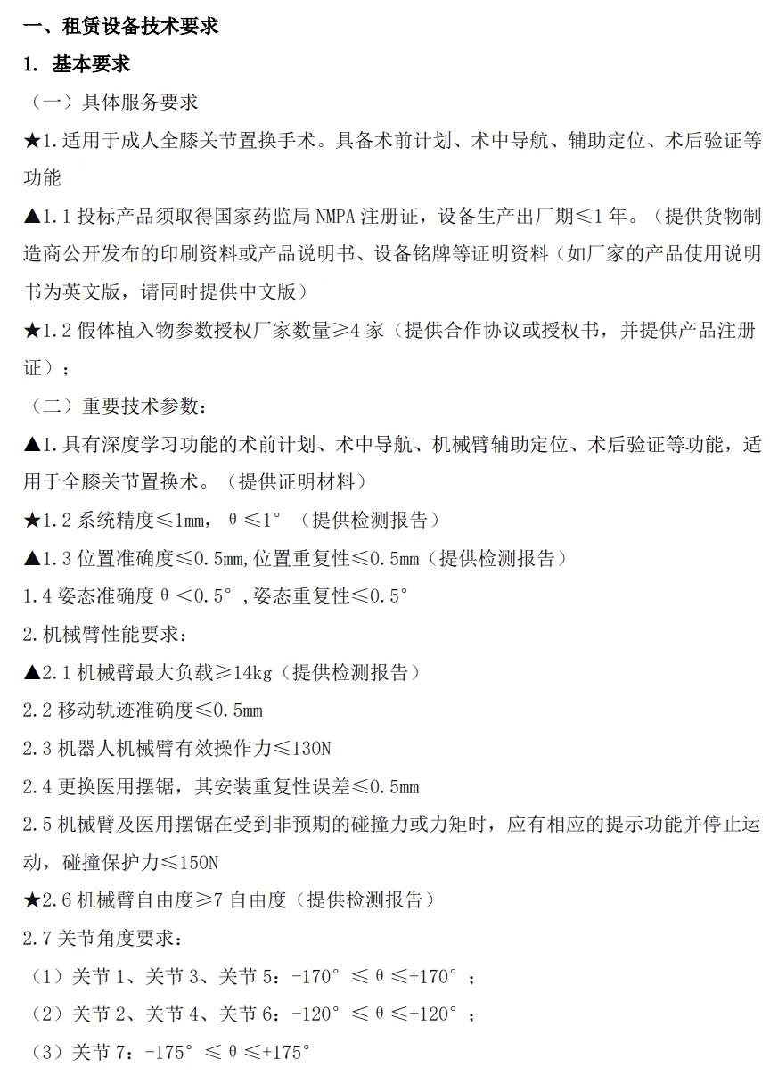 北京世纪坛医院关节骨科手术机器人租赁项目部分技术要求
