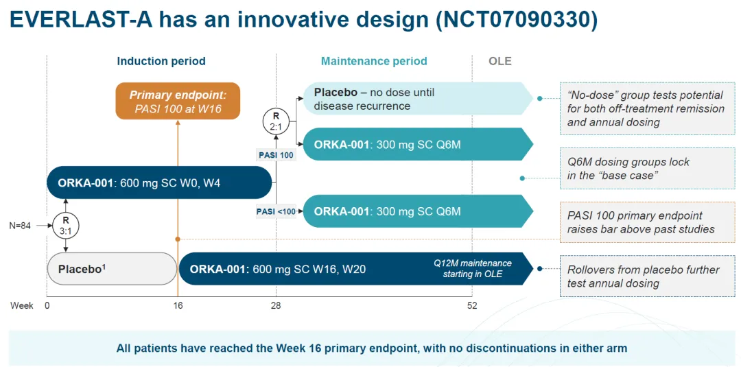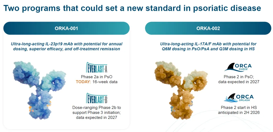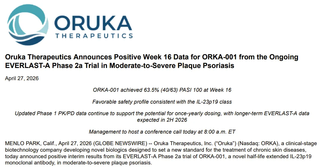 2026年4月27日,Oruka Therapeutics公布长效IL-23抗体ORKA-001治疗中至重度斑块型银屑病的2a期临床EVERLAST-A最新临床数据。