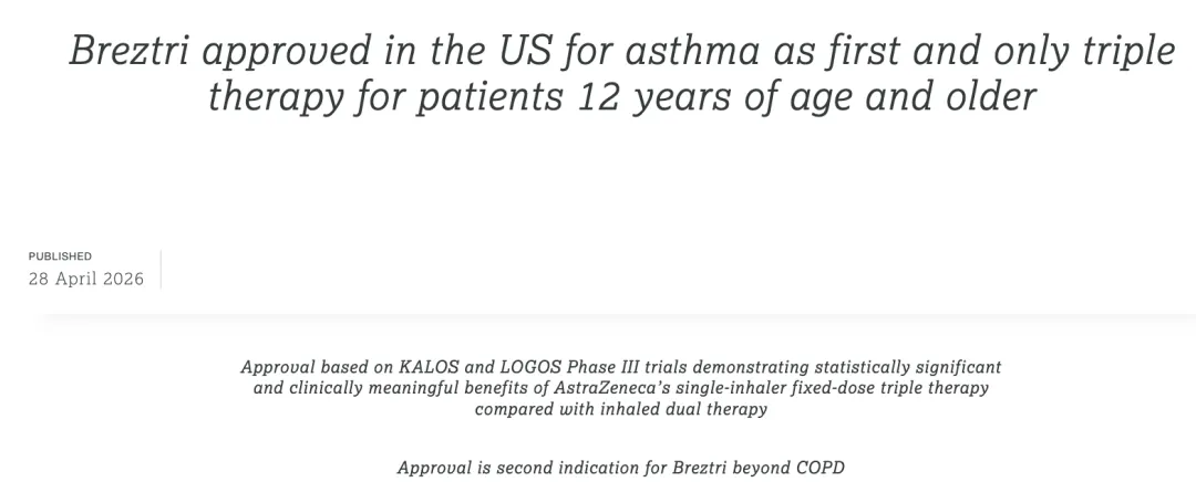 4 月 28 日,阿斯利康宣布,固定剂量三联疗法 Breztri(格隆溴铵+福莫特罗+布地奈德)已获 FDA 批准用于 12 岁及以上成人和儿童哮喘患者的维持治疗。