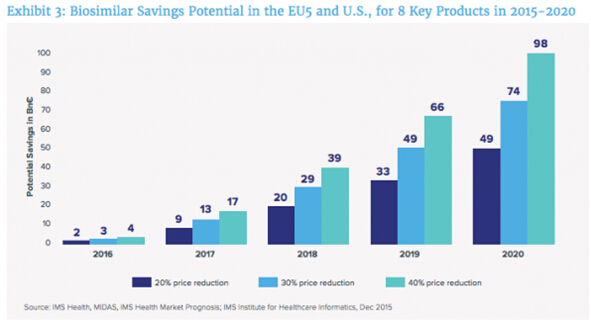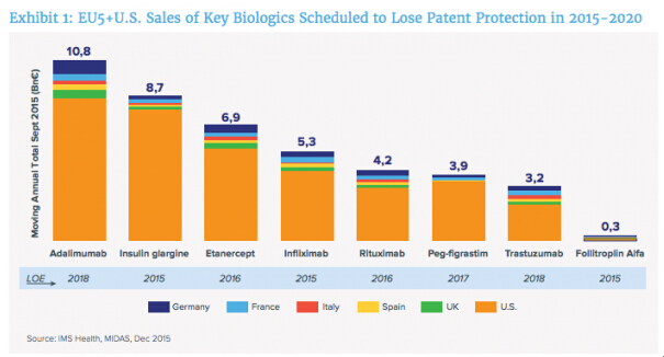根据全球知名的医药信息提供商IMS的数据:到2020年,仅在欧美地区,生物类似药的市场将达到1100亿美元。随着专利药的到期,未来5年,生物类似药将抢占20%的市场。